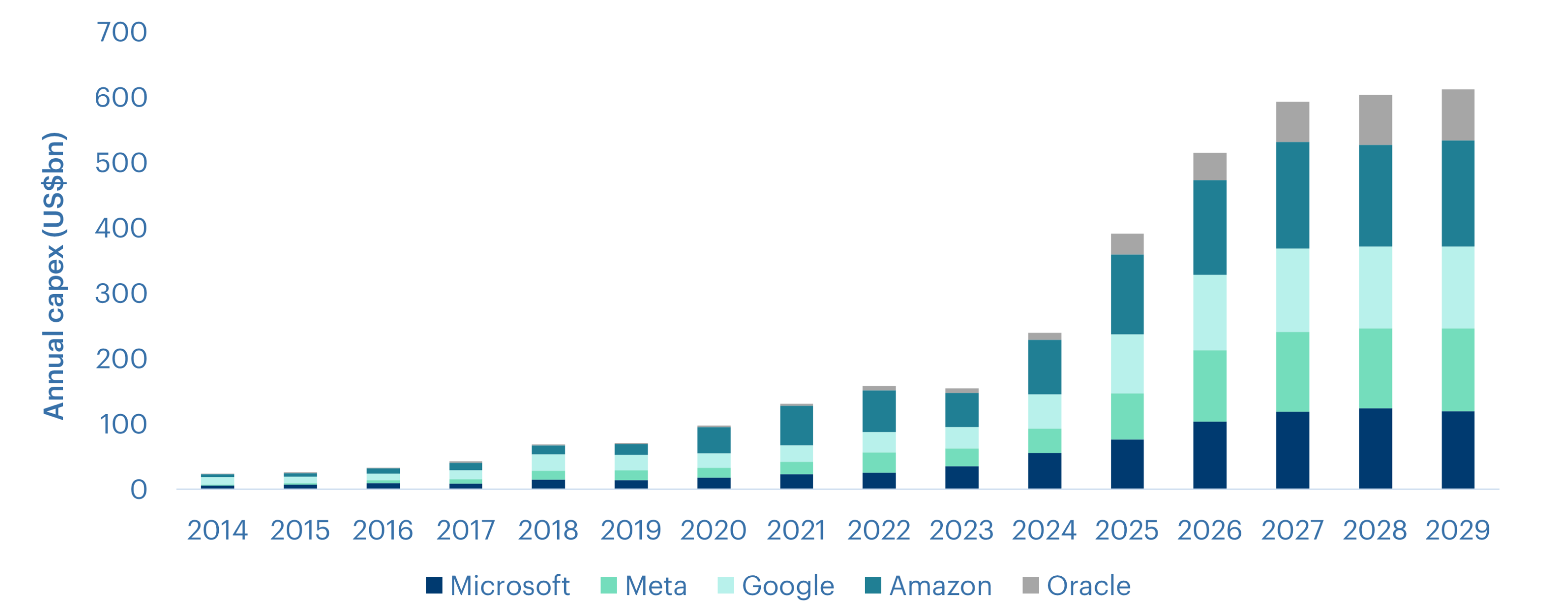Market analysts forecast around US$3-4 trillion will be spent on building out AI infrastructure over the next five years. If this doesn’t happen, or if it happens more slowly than expected, the valuations of semiconductor, data-centre and other AI-beneficiary stocks could be sharply recalibrated downward.