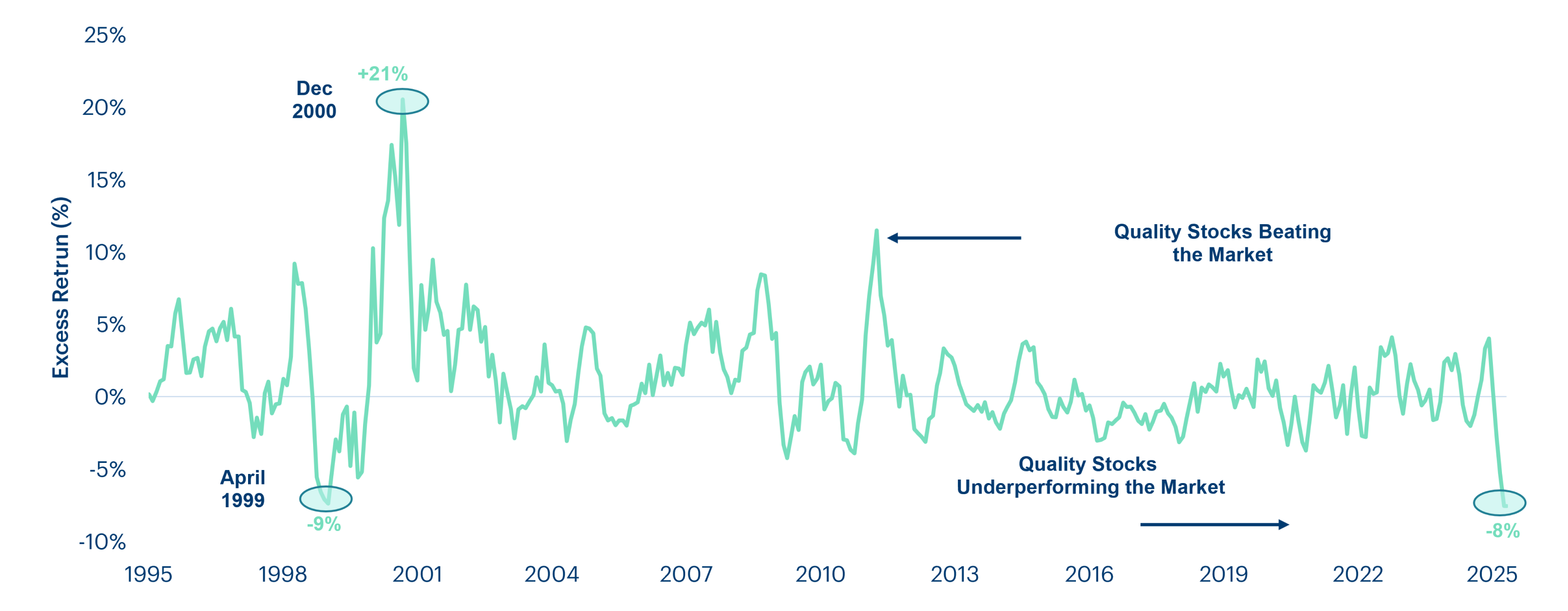 While excitement builds in the AI sphere, quality companies, those with strong balance sheets, durable earnings, and consistent returns on capital, have been left behind. By some measures, high-quality stocks like Visa, Costco and Coca-Cola, have lagged the market more than at any time in the last 25 years. The last time this happened was during the late-1990s tech bubble, when investors similarly crowded into a handful of growth names and ignored fundamentals. The pattern is familiar: valuation discipline erodes, story stocks dominate headlines, and prudent investing looks outdated – until it doesn’t.