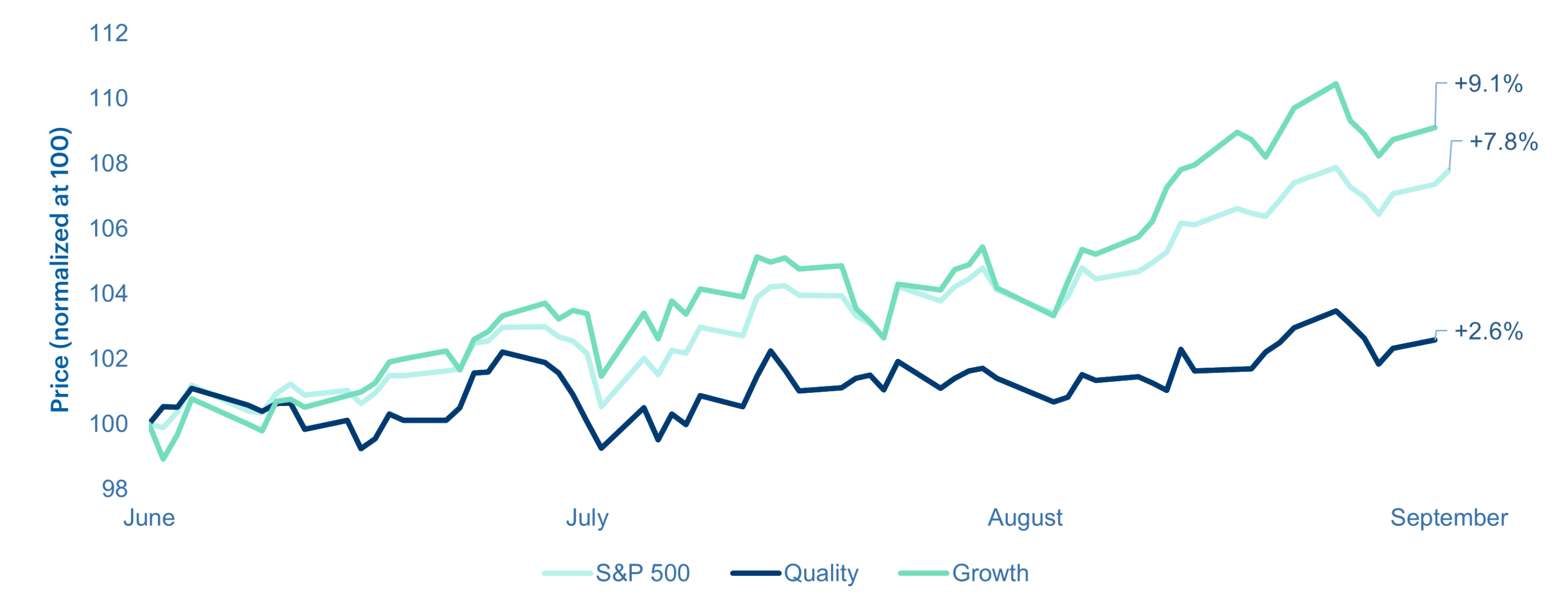 Quality oriented stocks, which are a hallmark of our investment style, have also lagged more speculative parts of the market in recent months. By “quality,” we mean companies with strong balance sheets, durable competitive positions, and reliable profits - as reflected in the S&P 500 Quality Index below. As the chart illustrates, quality has trailed growth materially in recent months, weighing on the relative performance of our portfolios.
