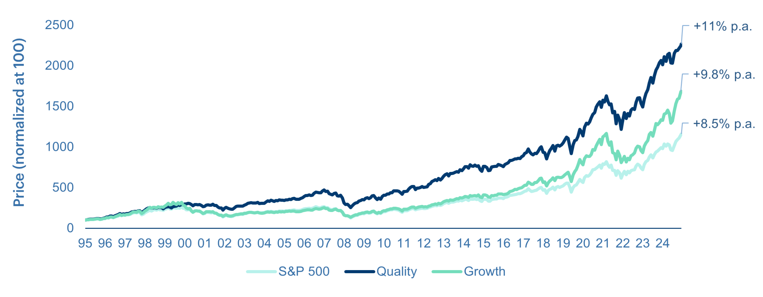 While quality may be out of favour in the current risk-seeking environment, history shows that it has won over the long run, ultimately delivering higher and less volatile returns (see chart below).