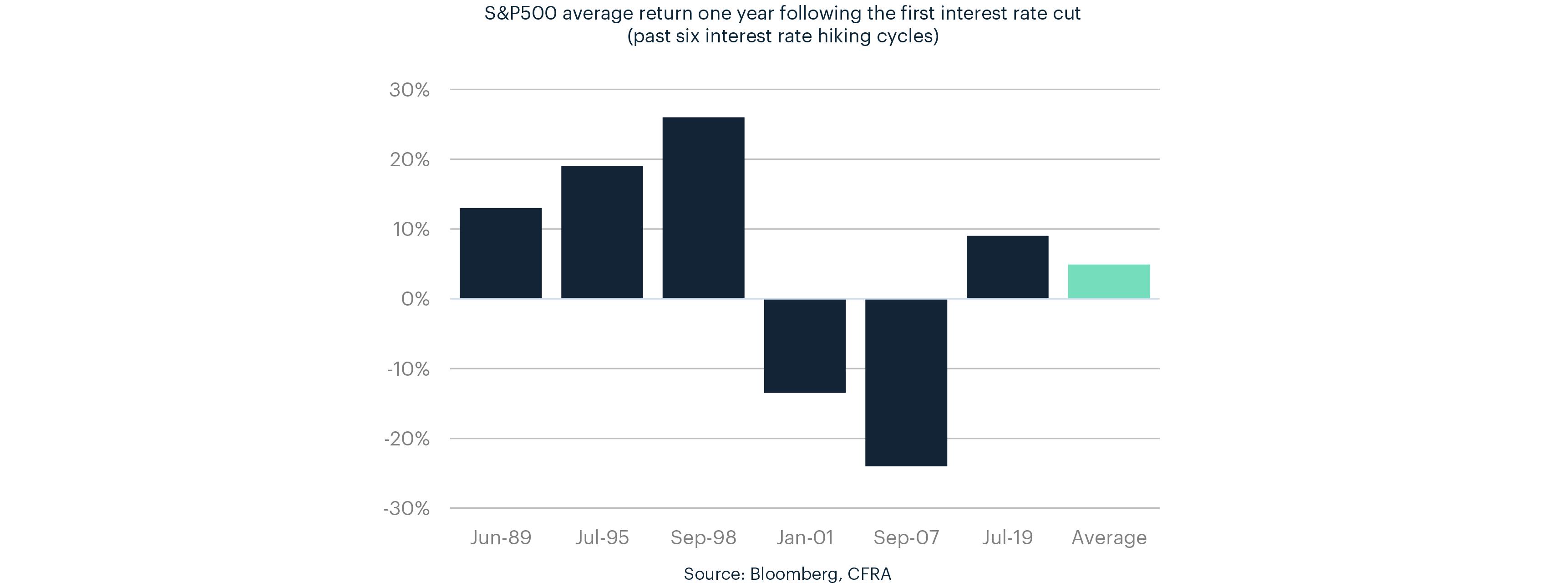 In the six previous interest rate hiking cycles, the US market has risen an average of 5% one year after the first rate cut. However, the caveat is that this performance hinges on the cut not being in reaction to a recession. What happened in 2001 and 2007 demonstrates the adverse outcomes when cuts occur in response to economic pain, and the central banks are playing catch up. Excluding those years, the average return jumps to +16.8%.
