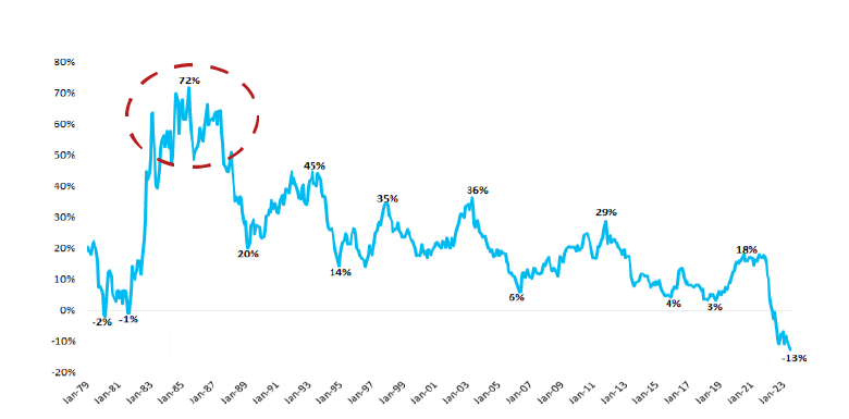 While yields are still nowhere near the levels seen in the 1980s, similar dynamics are at play. Yields are at decade highs, just as inflation is starting to subside. Should inflation continue to fall and central banks eventually cut interest rates, bonds could be in for a strong multi-year run. Even if central banks don’t cut rates, far better returns are likely to be in store for fixed income investors given current yields.
