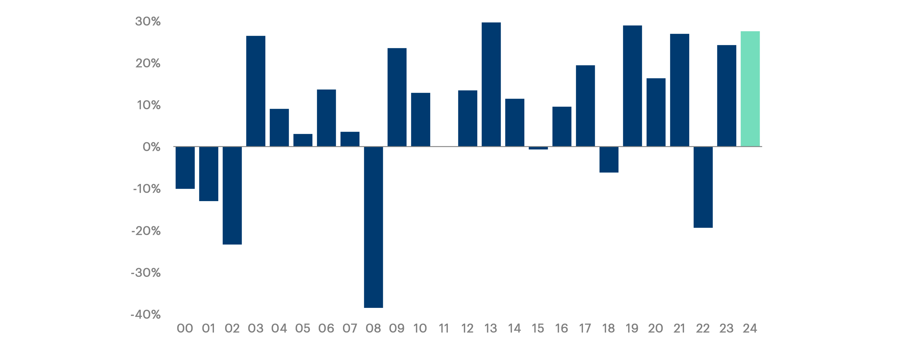 Fast forward to December, and 2024 has surpassed even the most optimistic predictions. The US market is poised to deliver annual gains exceeding 25%, positioning 2024 among the strongest yearly performances of this century. Notably, it would mark only the second time on record that this level has been achieved in back-to-back years (the last time was in 1954 & 1955).
