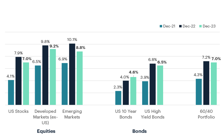 In December each year JP Morgan publishes detailed forecasts of expected asset class returns over the following 10 years. This year’s report shows that while expected long-term returns have come down slightly from last year’s predictions, the current environment of higher interest rates and lower valuation multiples sees them forecasting materially better returns than they did two years ago (and returns broadly in-line with the long-term history).
