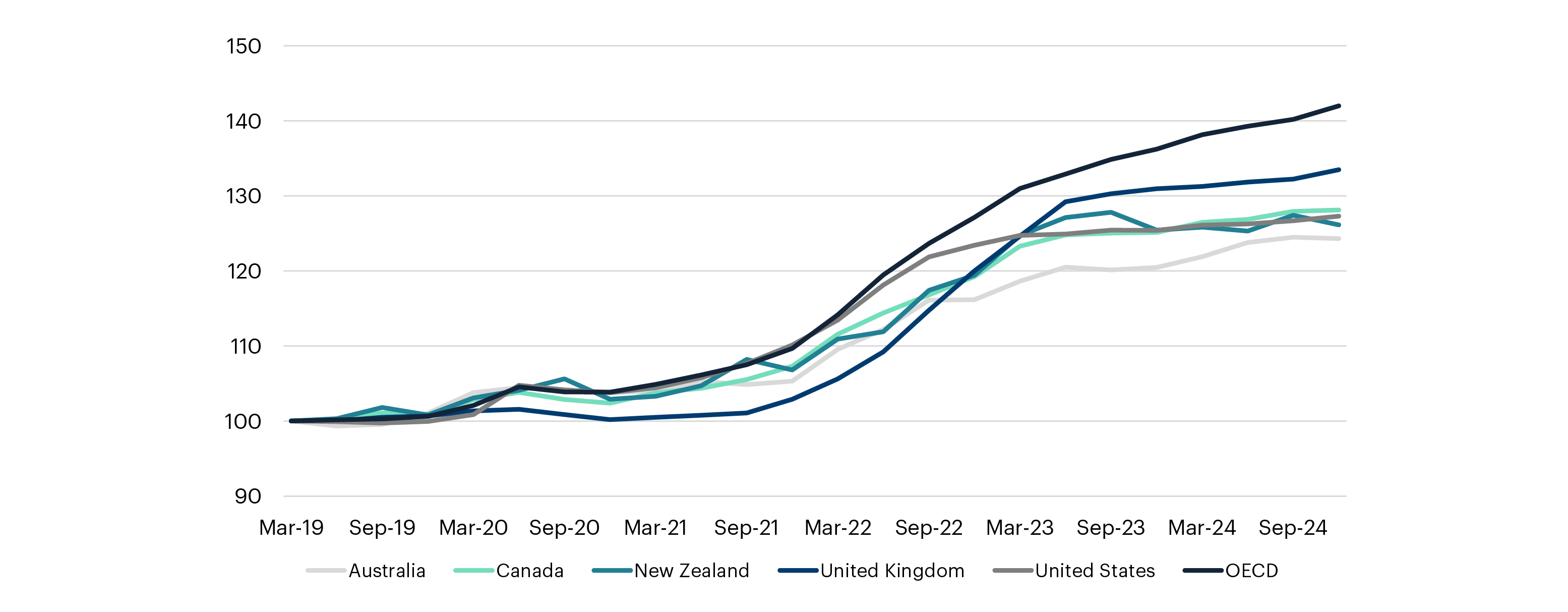 In Australia, annual real per capita household disposable income declined for a 10th successive quarter to December 2024 and is now down ~8.1% since the peak in June 2022. The pressure is being felt most in the 18-29 and 30-39 age cohorts who are spending less on essential goods, with only those aged 60+ spending more than inflation.