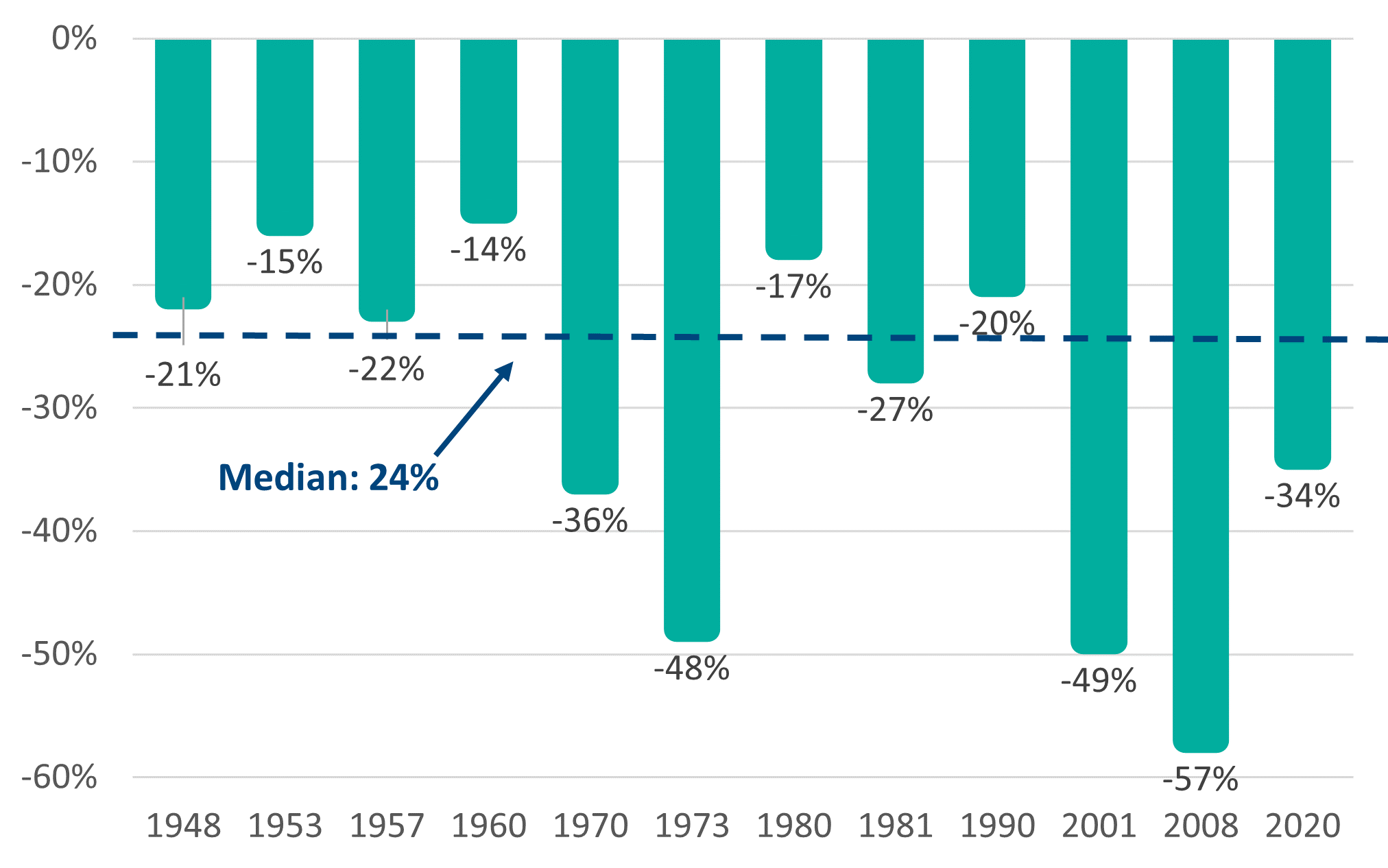 As can be seen from the chart below, in the 12 recessions since World War II, the S&P 500 Index has contracted from peak to trough by an average of 24%. A decline of this magnitude from the recent S&P 500 peak of approximately 4800 would bring the S&P 500 to 3650 (just 10% below current levels). If a recession does occur there may be a bit more downside, but investors must also factor in the scenario of no recession and a significant rally in markets as well.