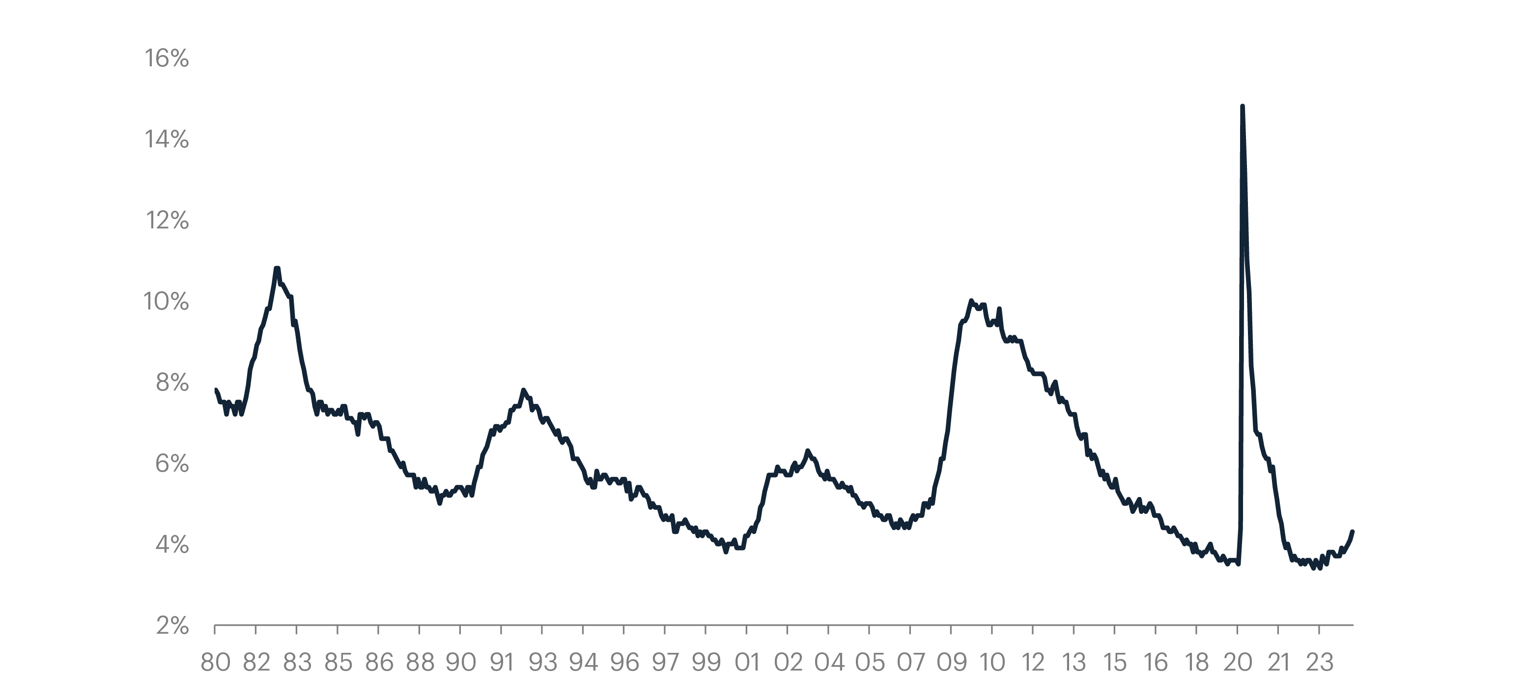 While high interest rates initially appeared to be slowing the US economy, a closer look at labour market data reveals that the situation is not as dire as it first appeared. The increase in unemployment has been driven primarily by a rise in the labour participation rate rather than widespread job losses – and job growth remains positive. Moreover, while increasing, an unemployment rate of 4.3% is still extremely low by historical standards.