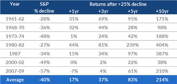The good news is that after a significant drawdown in markets, investors typically then experience much better returns in the following years. As the chart below shows, one year on from a 25% decline in markets, investors have experienced an average gain of 17%. Three years later markets were on average 37% higher, and 10 years later equity markets were a whopping 214% higher on average.