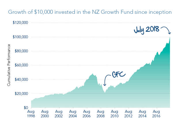 Fisher Funds will celebrate it’s 20th birthday in August 2018, and provide evidence of the most basic lesson that every teenager should learn. On August 1998 Carmel and Hugh Fisher launched the Fisher Funds New Zealand Growth Fund and the performance of this fund over the last 20 years is shown on the graph on this page.