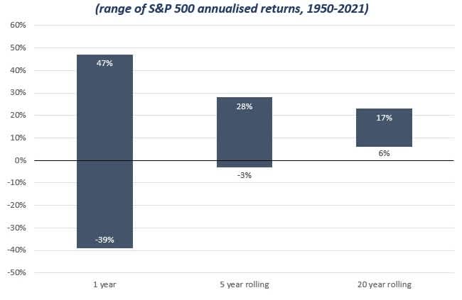 Focusing on 1-month or 1-year returns in markets, which are subject to the vagaries of human behaviour, isn’t at all helpful. Share prices get divorced from reality significantly over short periods of time. Over the longer term however, the share prices of companies tend to follow underlying economic fundamentals.