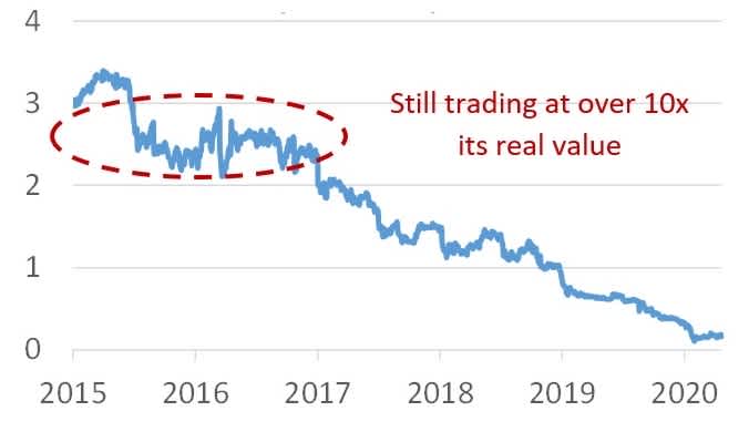 Sky TV used to have a wide moat given satellite was the only way to get a wide variety of quality TV content into your home. But fast broadband has almost made satellite TV redundant, and the ascendency of competitors like Netflix has seen a steady stream of customers dropping their Sky subscriptions. Despite this somewhat obvious development, Sky TV’s shares continued to be significantly overvalued in 2015 & 2016. This may have been partly due to shareholders not being willing to admit a mistake and take a loss on the investment, or because some dividend hungry investors decided they would take the risk and hang in there for what appeared to be an attractive (but illusionary) dividend yield. Sky TV’s share price has fallen over 90% in the last five years, and all due to their moat becoming obsolete due to new technology.